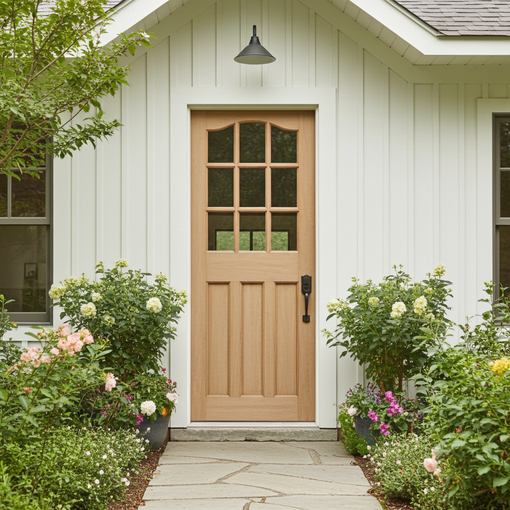 The 9 Light Arched Top Raised & Fielded Panel Bottom Stable Door mixes traditional raised and fielded panels with a cottage pane design.