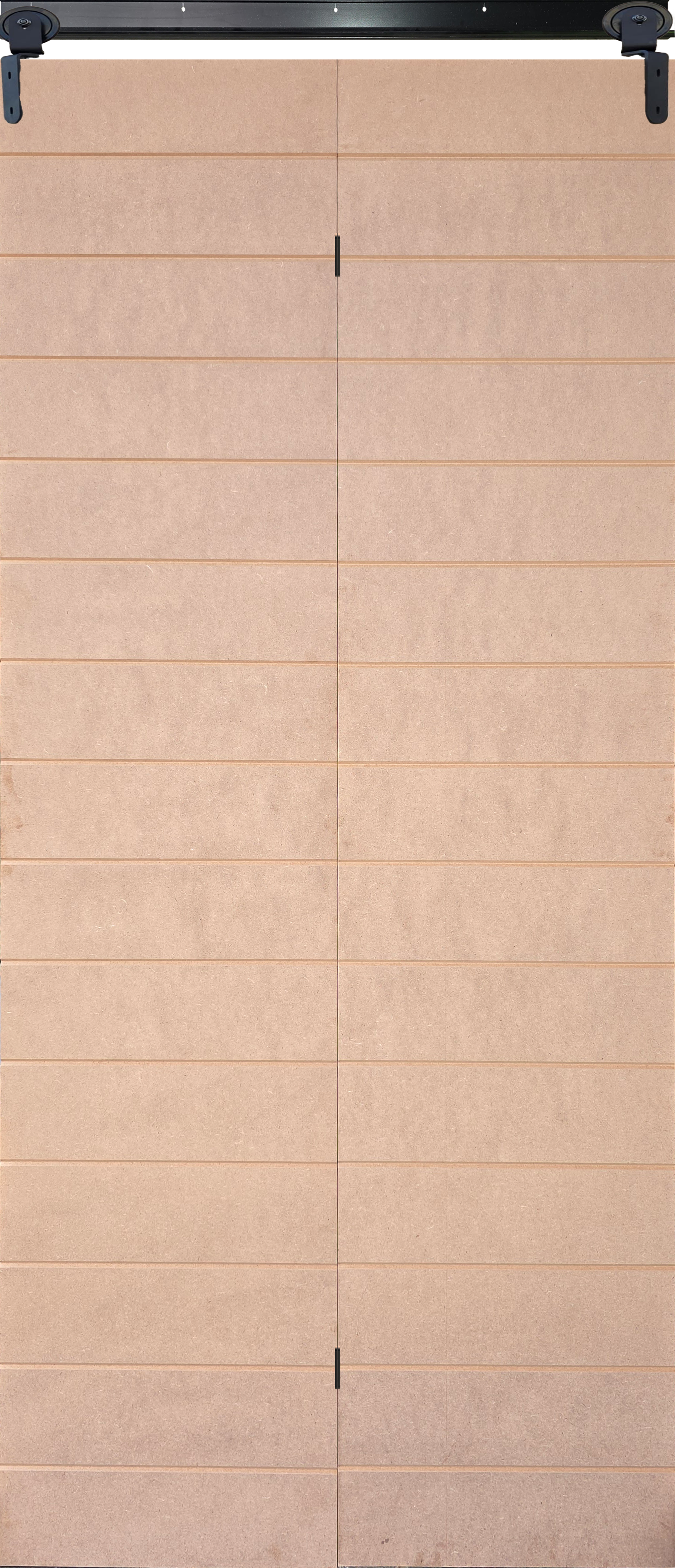 Product Overview The 14-Groove Medium Duty Bi-Fold Barn Door Kit is a space-saving interior door solution designed for modern homes. It features a bi-folding mechanism that slides along a black rail, reducing the door's swing footprint by 50% compared to traditional hinged doors. This specific model mimics the popular "slatted wall" or "shiplap" aesthetic with 14 deep-cut horizontal grooves.
